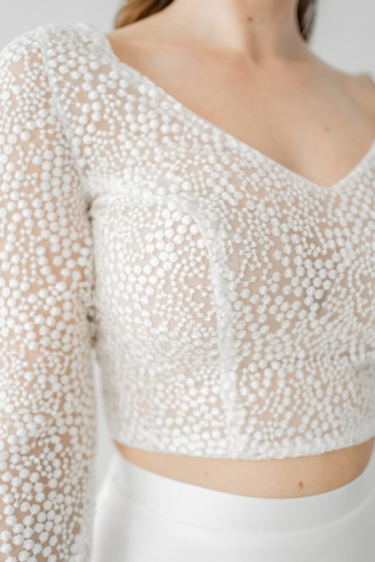 Das Top aus dichter, gepunkteter Spitze wirkt geschlossen und hochwertig, ohne schwer zu erscheinen. Die 3/4-Ärmel unterstreichen die Silhouette und bieten ein angenehmes Maß an Dichte, während der tiefe Rückenausschnitt einen bewussten Kontrast setzt. Eine feine Knopfreihe rundet das Design ab und bringt ein dezentes Detail in die klare Linienführung.