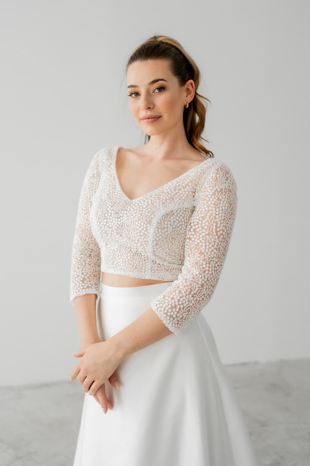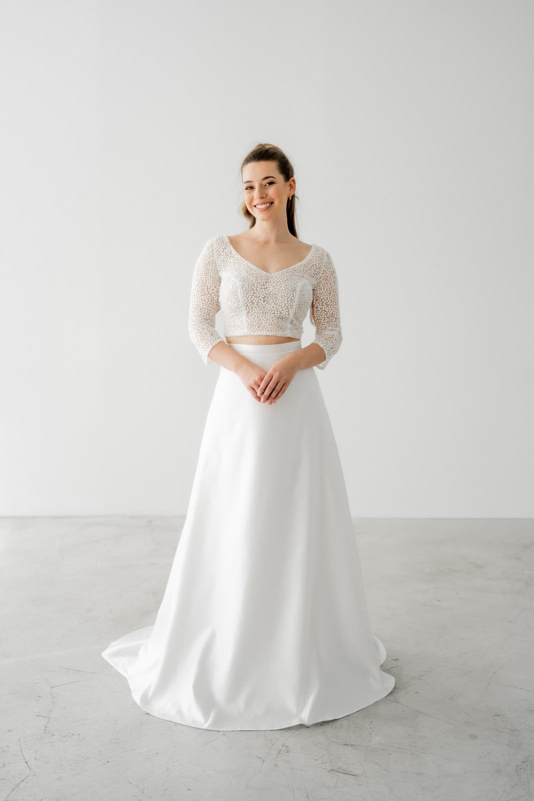 PINA ist eine Option für Bräute, die sich bedeckter fühlen möchten und gleichzeitig Wert auf eine moderne, reduzierte Gestaltung legen.